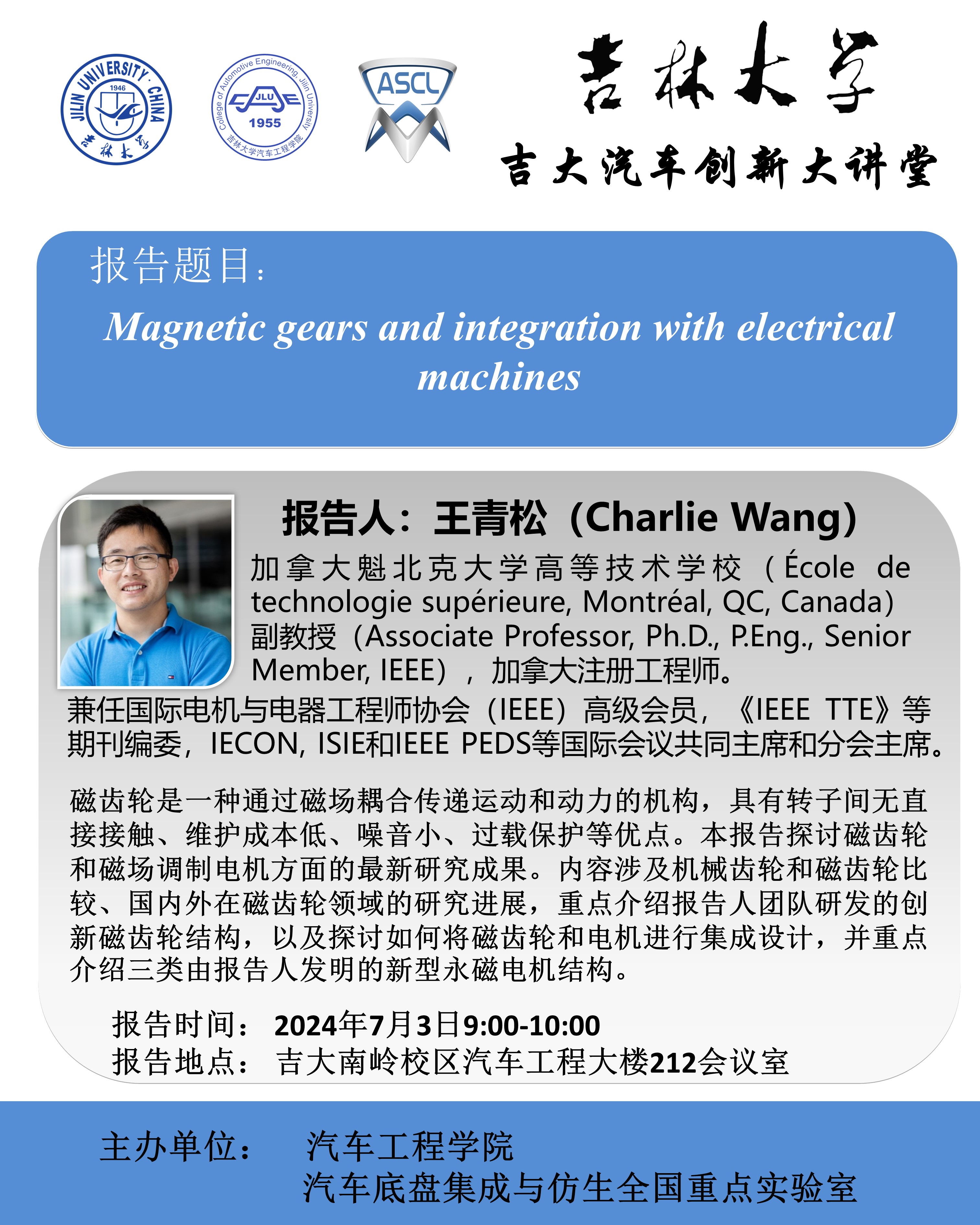 王青松博士简介:王青松博士是我院2008级车辆工程专业本科生,2012年保送至同济大学攻读硕士学位,2015年至2018年在香港理工大学电气工程专业攻读博士学位。2019至2021年在英国考文垂大学先进低碳驱动研究中心担任讲师,现为加拿大魁北克大学高等技术学校副教授,加拿大注册工程师。王博士为国际电机与电器工程师协会(IEEE)高级会员、《IEEE TTE》等期刊编委,并担任IECON, ISIE和IEEE PEDS等国际会议的共同主席和分会主席。王博士在磁齿轮,磁场调制电机和无线充电领域取得了多项创新性成果。目前主持多项加拿大自然科学基金(NSERC)和魁北克自然科学基金(FRQNT)项目,在IEEE Trans. on Trans. Elect.,IEEE Trans. Ind. Electron., IEEE Trans. Magn., IEEE Trans. Power Electron.等国际SCI期刊和IEEE各类国际会议发表论文40余篇。